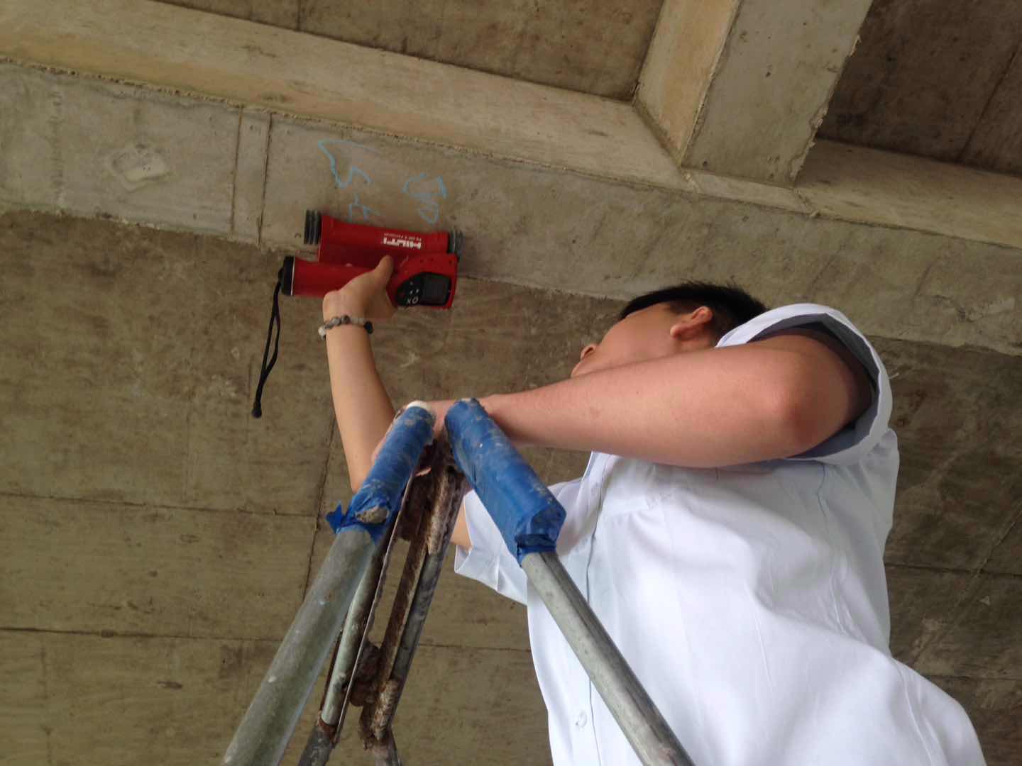 3、采用现场检测仪器,对受损构件和相应的未受损构件进行对比检测。