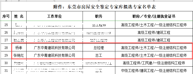 近日,从东莞市住建局传来喜报,我司总经理杨孝先生、副总经理张艳红女士通过评选公示,成功当选东莞市房屋安全鉴定专家库专家。